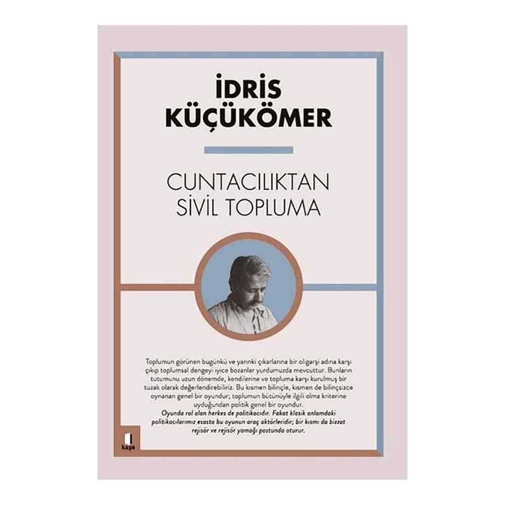 İdris Küçükömer… Türkiye’deki siyaset teorisine yeni bir bakış açısı getirmiş önemli iktisatçı düşünürlerimizden biri.Fikirleri, sıklıkla vurgulandığı üzere “Türkiye’de sağ sol, sol da sağdır” gibi yalnızca tek bir cümleye indirgenemeyecek kadar renkli ve zengin.Cuntacılıktan Sivil Topluma, 1960 yılından itibaren güncel ekonomi politikaları üzerine Yön ve Ant dergilerinde yazdığı makalelerden oluşuyor. İdris Küçükömer’in, özellikle sivil toplum, halkbürokrasi ayrımı, vatandaş ve tebaa ilişkisi üzerine yaptığı tartışmalar kendi dönemini de derinden etkiledi.Yazılarında daima sorgulayan, eleştiren, yeni siyaset biçimleri öneren bir ton kullandı. Küçükömer, hep yeni sorular soran bir iktisat filozofu… (Tanıtım Bülteninden)
