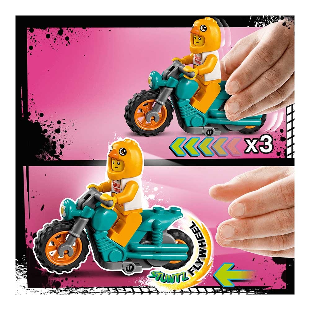 - Bu aksiyon dolu volanlı LEGO® City Tavuk Gösteri Motosikleti (60310) oyun seti, tek tekerlek üzerinde havalı hareketler ve havada gösteriler