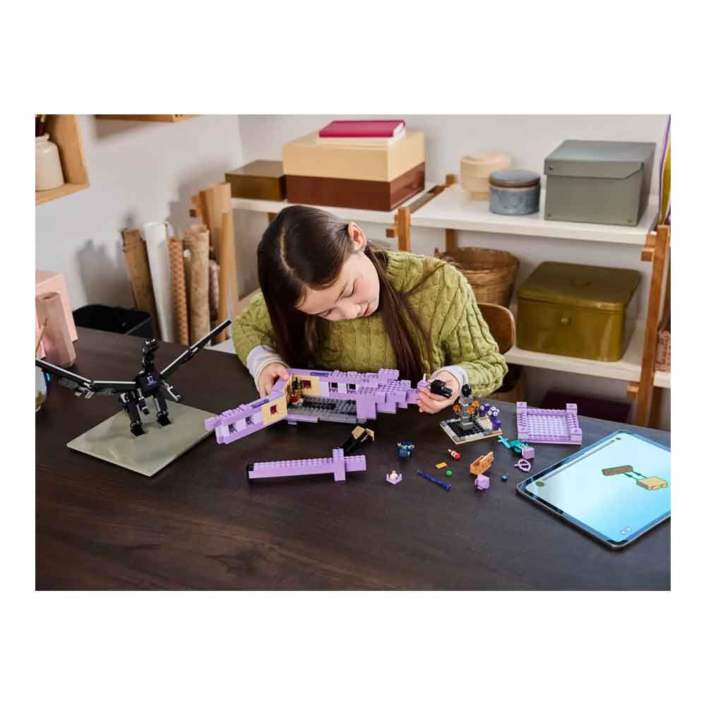 Ejderha hayranları için yapım seti – Bu LEGO® Minecraft® çocuk oyuncağı; silahlar, Ender Kaşifi’nin elytra kanatları, havai - fişek roketi ve değerli ejderha yumurtası gibi orijinal detaylar içerir