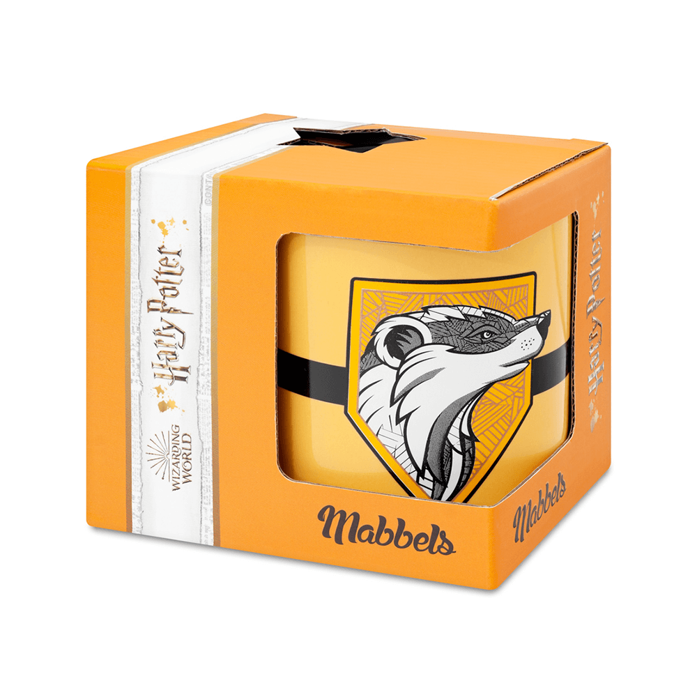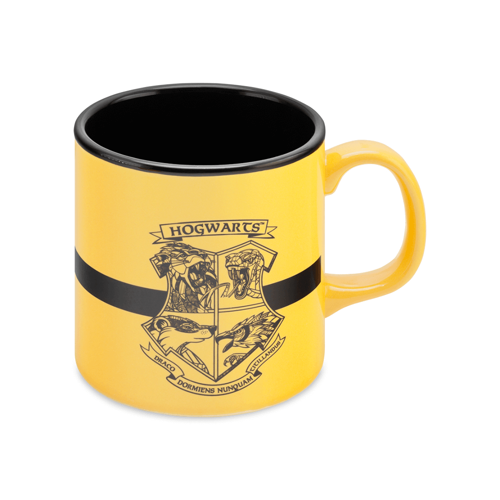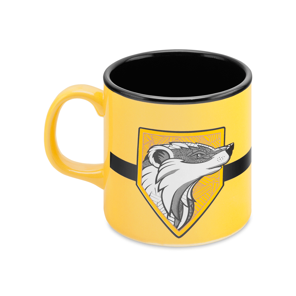 - Hufflepuff simgesi porsuk ikonik Hogwarts logosuyla bu mug üzerinde buluştu.