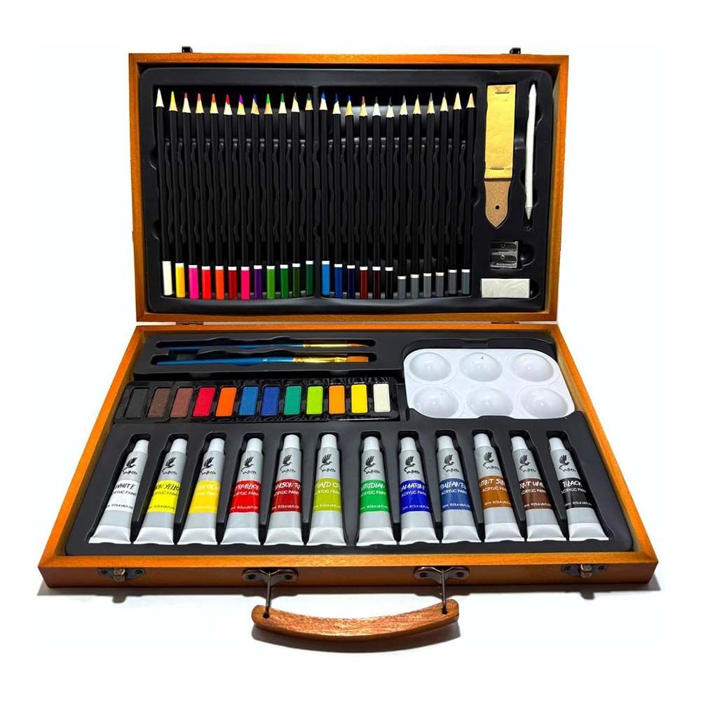 56 parça resim seti içeriği, temel çizim ve boyama ihtiyaçlarını karşılamak üzere hazırlanmıştır. Dayanıklı yapıya sahip ahşap kutulu boyama seti, evde, okulda veya seyahatlerde rahat kullanım sunar. Estetik tasarımı sayesinde hediye çizim seti olarak da tercih edilebilir.