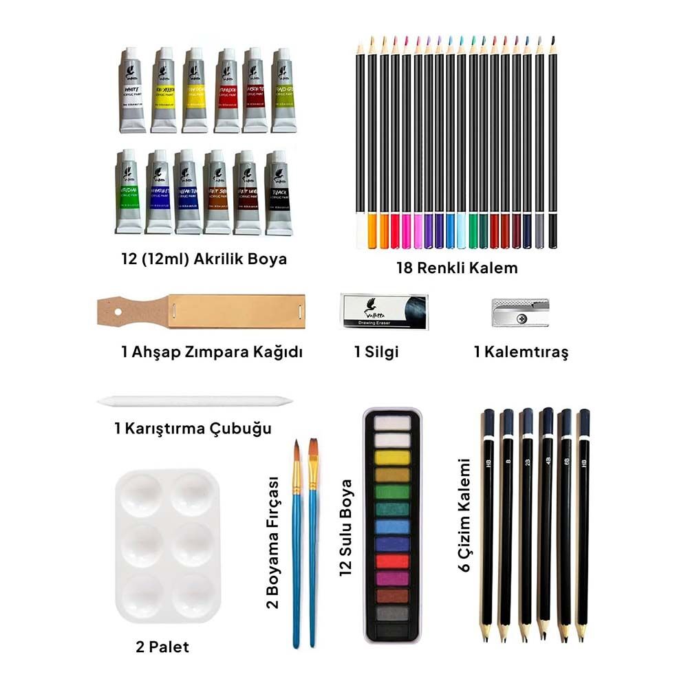 Valetta Bergamo Ahşap Taşıma Çantalı Çizim ve Boyama Seti 56 Parça, çocuklar ve çizime yeni başlayan kullanıcılar için tasarlanmış, düzenli ve taşınabilir bir çizim ve boyama setidir. Ahşap taşıma çantası sayesinde tüm malzemeler tek bir yerde saklanır ve kolayca taşınabilir.